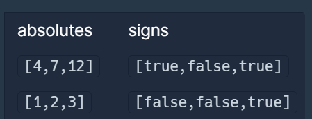 - absolutes의 길이는 1 이상 1,000 이하입니다. · absolutes의 모든 수는 각각 1 이상 1,000 이하입니다. - signs의 길이는 absolutes의 길이와 같습니다. · signs[i] 가 참이면 absolutes[i] 의 실제 정수가 양수임을, 그렇지 않으면 음수임을 의미합니다.