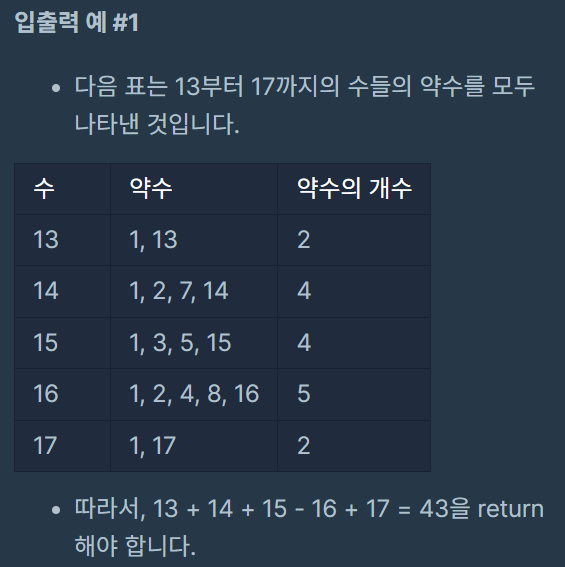 left부터 right까지의 모든 수들 중에서, 약수의 개수가 짝수인 수는 더하고, 약수의 개수가 홀수인 수는 뺀 수를 return 하도록 solution 함수를 완성해주세요.