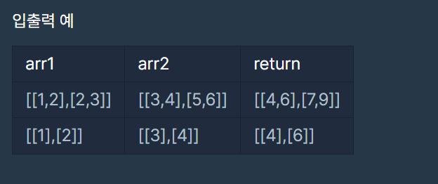 2개의 행렬 arr1과 arr2를 입력받아, 행렬 덧셈의 결과를 반환하는 함수, solution을 완성해주세요.