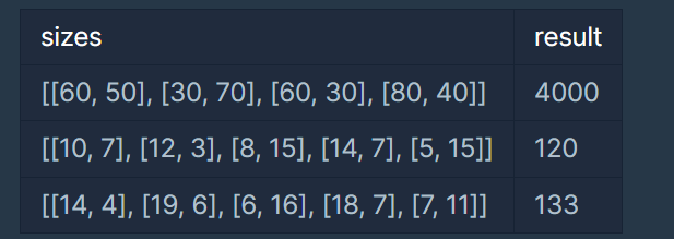 가장 긴 가로 길이와 세로 길이가 각각 80, 70이기 때문에 80(가로) x 70(세로) 크기의 지갑을 만들면 모든 명함들을 수납할 수 있습니다. 하지만 2번 명함을 가로로 눕혀 수납한다면 80(가로) x 50(세로) 크기의 지갑으로 모든 명함들을 수납할 수 있습니다. 이때의 지갑 크기는 4000(=80 x 50)입니다. 모든 명함의 가로 길이와 세로 길이를 나타내는 2차원 배열 sizes가 매개변수로 주어집니다. 모든 명함을 수납할 수 있는 가장 작은 지갑을 만들 때, 지갑의 크기를 return 하도록 solution 함수를 완성해주세요.