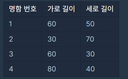 명함 지갑을 만드는 회사에서 지갑의 크기를 정하려고 합니다. 다양한 모양과 크기의 명함들을 모두 수납할 수 있으면서, 작아서 들고 다니기 편한 지갑을 만들어야 합니다. 이러한 요건을 만족하는 지갑을 만들기 위해 디자인팀은 모든 명함의 가로 길이와 세로 길이를 조사했습니다. 아래 표는 4가지 명함의 가로 길이와 세로 길이를 나타냅니다.