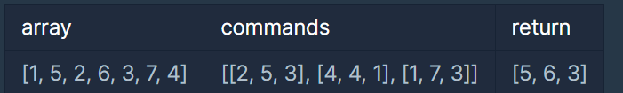 - array의 길이는 1 이상 100 이하입니다. - array의 각 원소는 1 이상 100 이하입니다. - commands의 길이는 1 이상 50 이하입니다. - commands의 각 원소는 길이가 3입니다.