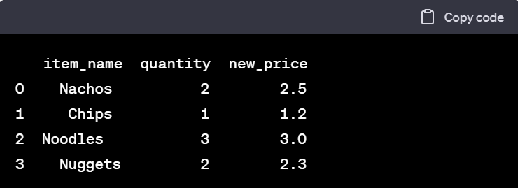 'lst가 [2.5, 3.0] 이라면 df.loc[df.new_price.isin(lst)] 코드를 실행하면 'new_price' 열의 값이 다음과 같은 결과가 반환됩니다.