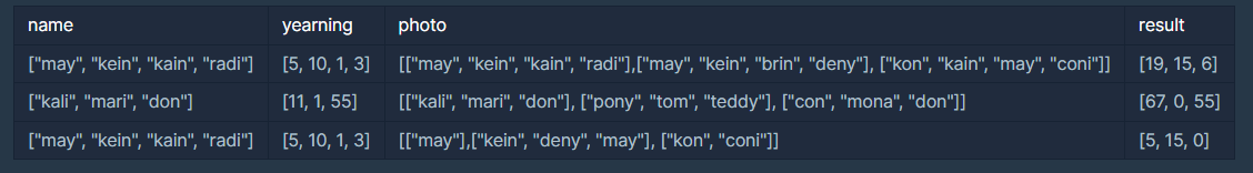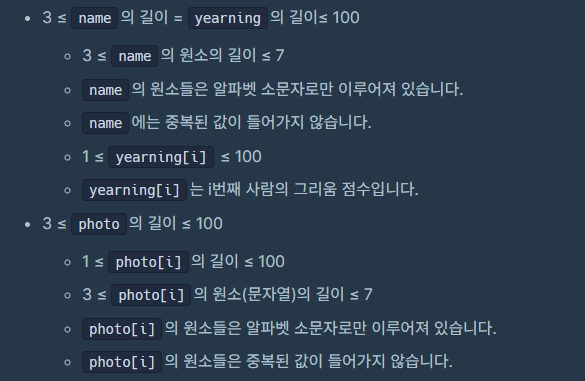 사진들을 보며 추억에 젖어 있던 루는 사진별로 추억 점수를 매길려고 합니다. 사진 속에 나오는 인물의 그리움 점수를 모두 합산한 값이 해당 사진의 추억 점수가 됩니다. 예를 들어 사진 속 인물의 이름이 ["may", "kein", "kain"]이고 각 인물의 그리움 점수가 [5점, 10점, 1점]일 때 해당 사진의 추억 점수는 16(5 + 10 + 1)점이 됩니다. 다른 사진 속 인물의 이름이 ["kali", "mari", "don", "tony"]이고 ["kali", "mari", "don"]의 그리움 점수가 각각 [11점, 1점, 55점]]이고, "tony"는 그리움 점수가 없을 때, 이 사진의 추억 점수는 3명의 그리움 점수를 합한 67(11 + 1 + 55)점입니다. 그리워하는 사람의 이름을 담은 문자열 배열 name, 각 사람별 그리움 점수를 담은 정수 배열 yearning, 각 사진에 찍힌 인물의 이름을 담은 이차원 문자열 배열 photo가 매개변수로 주어질 때, 사진들의 추억 점수를 photo에 주어진 순서대로 배열에 담아 return하는 solution 함수를 완성해주세요.