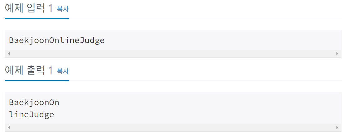입력으로 주어진 단어를 열 개씩 끊어서 한 줄에 하나씩 출력한다. 단어의 길이가 10의 배수가 아닌 경우에는 마지막 줄에는 10개 미만의 글자만 출력할 수도 있다.