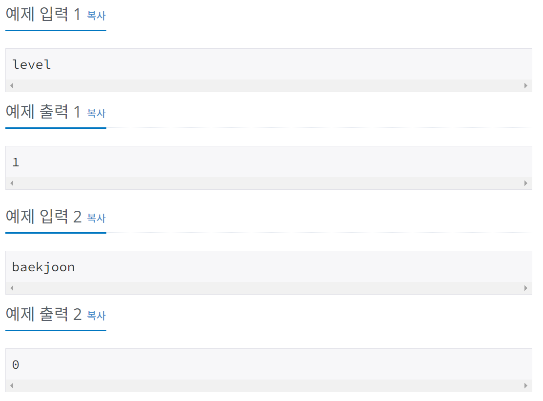 level, noon은 팰린드롬이고, baekjoon, online, judge는 팰린드롬이 아니다.