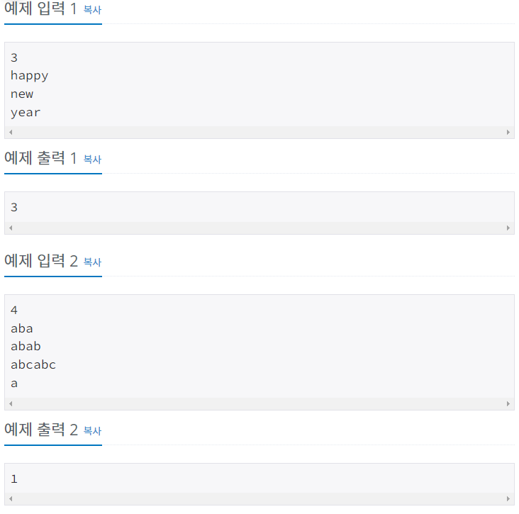 단어 N개를 입력으로 받아 그룹 단어의 개수를 출력하는 프로그램을 작성하시오.