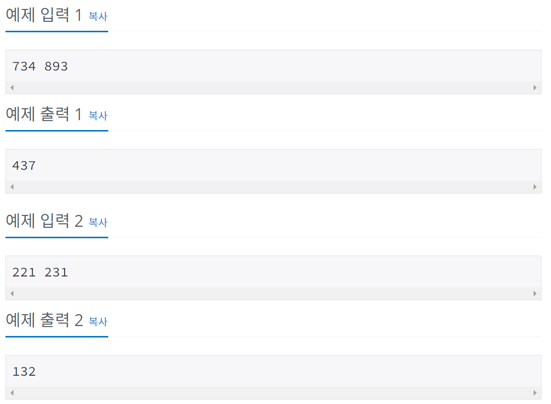 첫째 줄에 상근이가 칠판에 적은 두 수 A와 B가 주어진다. 두 수는 같지 않은 세 자리 수이며, 0이 포함되어 있지 않다.