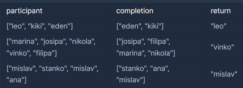 예제 #1 "leo"는 참여자 명단에는 있지만, 완주자 명단에는 없기 때문에 완주하지 못했습니다.