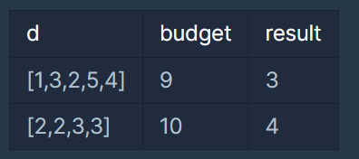 부서별로 신청한 금액이 들어있는 배열 d와 예산 budget이 매개변수로 주어질 때, 최대 몇 개의 부서에 물품을 지원할 수 있는지 return 하도록 solution 함수를 완성해주세요.