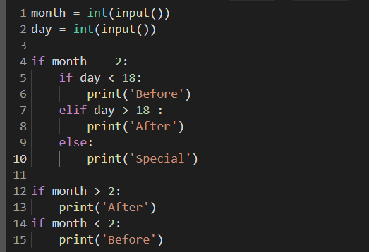 만약 날짜가 2월 18일 전이면, "Before"을 출력한다. 만약 날짜가 2월 18일 후면, "After"을 출력한다. 만약 2월 18일이라면 "Special" 을 출력한다.