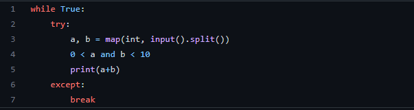 각 테스트 케이스는 한 줄로 이루어져 있으며, 각 줄에 A와 B가 주어진다. (0 < A, B < 10)