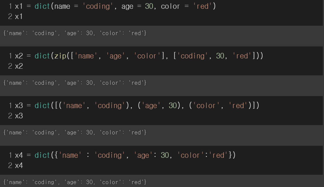 - 딕셔너리 = dict(key1 = value1, key2 = value2)