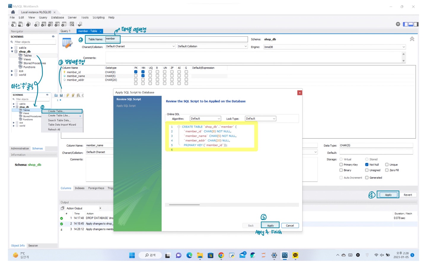 - 테이블 설계하기 -> 열 이름과 데이터 형식을 지정하기