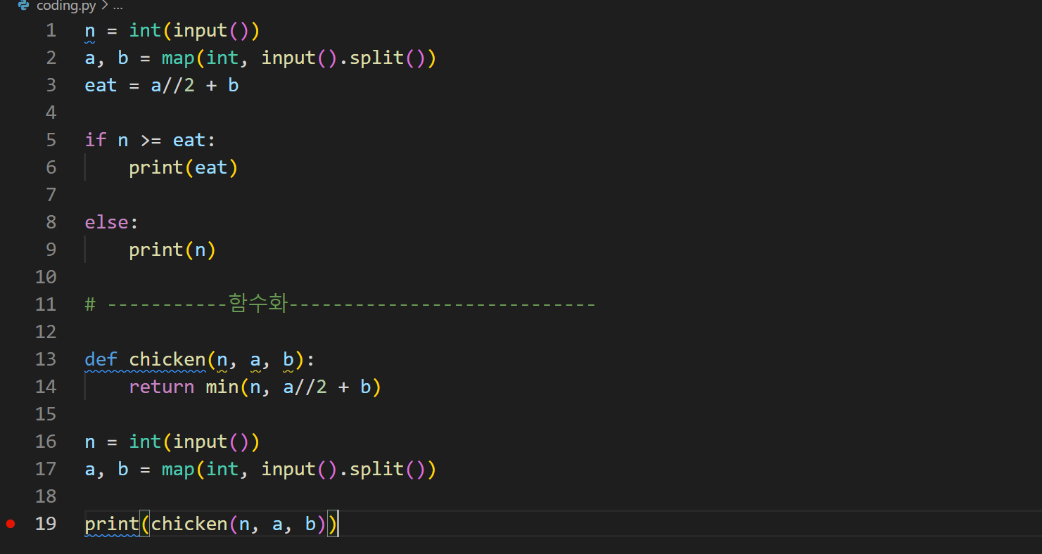 치킨집에 있는 치킨의 개수와 임스의 집에 있는 콜라, 맥주의 개수가 주어졌을 때, 임스가 시켜먹을 수 있는 치킨의 총 개수를 출력하시오.
