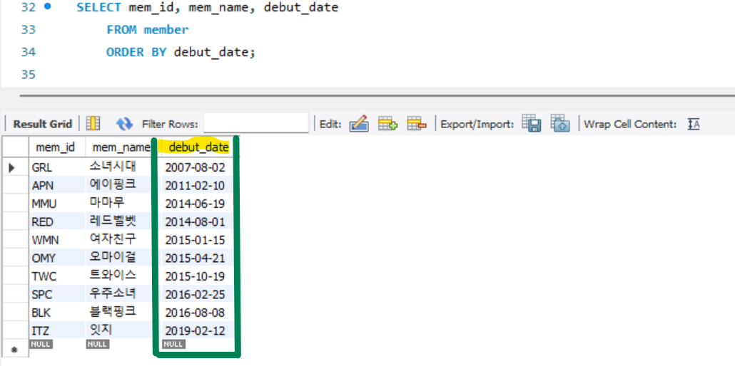 : 기본값은 ASC(Ascending) 오름차순을 의미, DESC(Descending) 내림차순을 의미