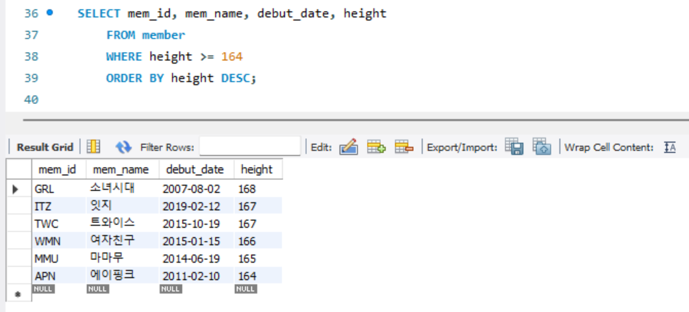 ① SELECT * FROM member ORDER BY height;
