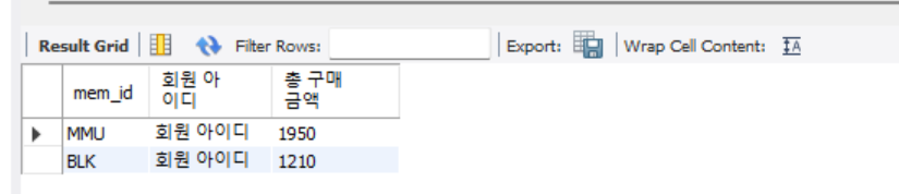 SELECT mem_id, "회원 아이디", SUM(price * amount) "총 구매 금액"