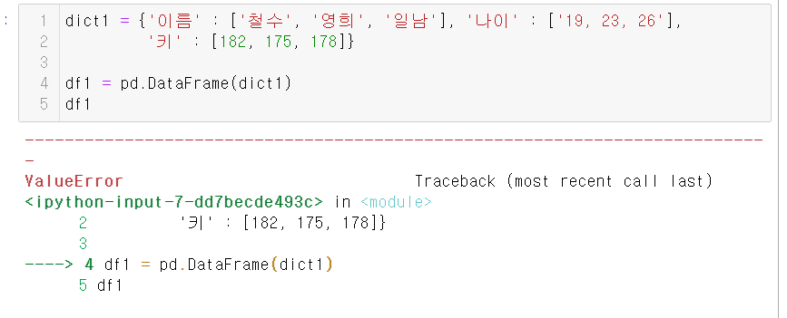 [에러 수정] python, numpy, pandas 에러 구문 해결하기 💡 ValueError: arrays must all be same length ■ 배열의 길이가 모두 동일해야 한다는 의미 ■ '나이' 값이 모두 하나의 문자열로 연결되어 있어서 발생함 ■ 수정 : [ '19, 23, 26' ] -------> [ 19, 23, 26 ] 인공지능, 데이터분석/[python] 문법, 실습문제 2023.05.12