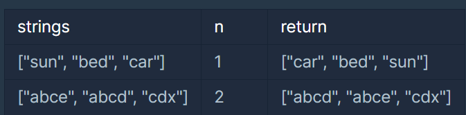 https://school.programmers.co.kr/learn/courses/30/lessons/12915 프로그래머스 코드 중심의 개발자 채용. 스택 기반의 포지션 매칭. 프로그래머스의 개발자 맞춤형 프로필을 등록하고, 나와 기술 궁합이 잘 맞는 기업들을 매칭 받으세요. programmers.co.kr 📝 문제설명 문자열로 구성된 리스트 strings와, 정수 n이 주어졌을 때, 각 문자열의 인덱스 n번째 글자를 기준으로 오름차순 정렬하려 합니다. 예를 들어 strings가 ["sun", "bed", "car"]이고 n이 1이면 각 단어의 인덱스 1의 문자 "u", "e", "a"로 strings를 정렬합니다. 🔗 제한 사항 - strings는 길이 1 이상, 50이하인 배열입니다. - stri..